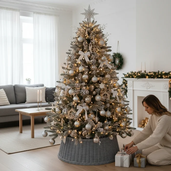 SEND THE DESIRED DIMENSIONS TO THE SELLER ALONG WITH YOUR ORDER NUMBER. Rattan Christmas Pine Tree Foot, which gives your Christmas tree a warm and stylish look with its natural rattan texture, is specially designed to aesthetically hide the foot of your pine tree and complete your decoration. Handcrafted, this decorative stand fits perfectly into both modern and classic Christmas concepts. Thanks to its durable structure, it can be used for many years. Product features: Two Size Options: 50 cm diameter • 23 cm height 55 cm diameter • 23 cm height Color Options: Walnut, Oak, White, Grey Natural and simple appearance Completely covers the metal foot of the Christmas tree It is easily portable and durable Compatible with any Christmas theme Usage Area: Christmas is placed under pine trees for decorative purposes. It is used as a tree skirt and makes the tree look more organized, professional and aesthetic.