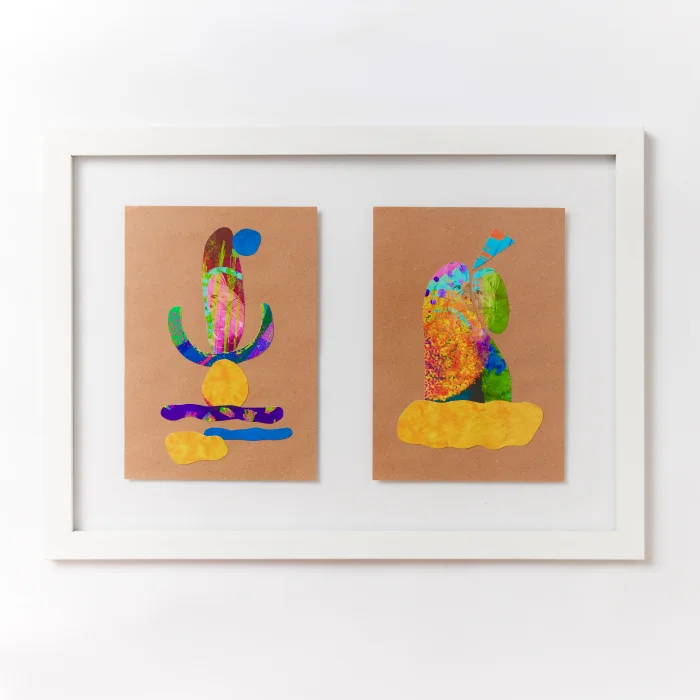 The application of digital illustrations on kraft paper with collage technique, the original work is framed between two glasses without passe-partout.