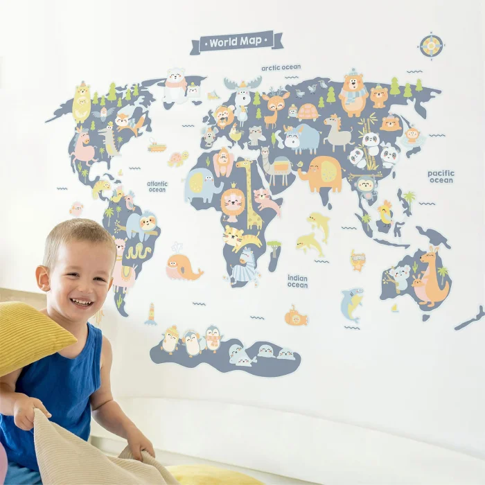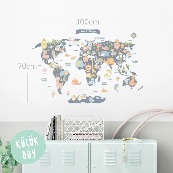 Printed on high-quality European vinyl, using biodegradable eco-solvent inks, they are waterproof and fade resistant. The matte finish ensures a high-quality look. They are self-adhesive and precisely cut along the contours. So, all you have to do is peel and stick them on your wall. They can be applied on almost any smooth surface including walls, tiles, windows, mirrors, wooden furniture, laptops. They may also adhere to slightly textured walls.Small pieces are very easy to apply. However, you might better get a friend’s help to apply the large pieces correctly. Before application, please make sure your walls and your hands are clean and dry.Product: Animal Kingdom - English World Map Wall Sticker
