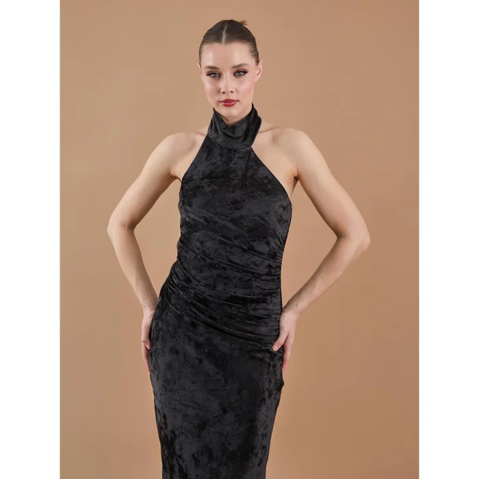 PRODUCT TANIMIOffering a stylish and sophisticated look, the velvet midi dress with an asymmetrical neckline provides comfort with its soft texture and fits the body perfectly with its elegant cut. An ideal choice for special occasions and elegant evenings!