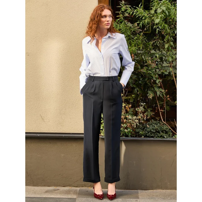 Double Leg Iron-Scarred Fabric Trousers Navy Blue is a trouser that offers elegance with its quality fabric and iron-mark detail, and has a modern look with its double-leg design. Ideal for painting .
