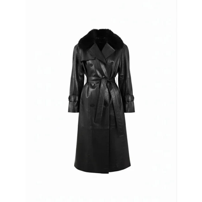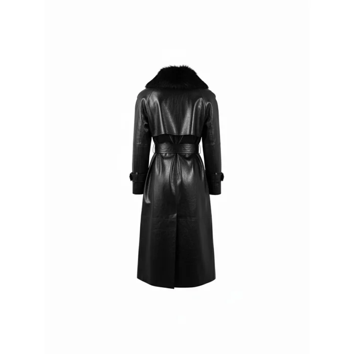 Enriched with a fur collar detail, this black leather trench coat offers a strong and elegant silhouette. A statement piece that combines elegance and character.