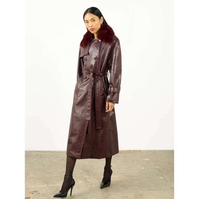 Enriched with a fur collar detail, this burgundy leather trench coat offers a strong and elegant silhouette. A statement piece that combines elegance and character.