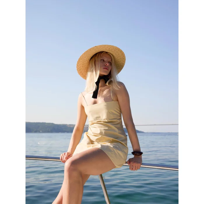 Reflecting the summer energy with its vibrant yellow color and light poplin fabric, the strappy mini dress stands out in both day and evening combinations with its simple design. A comfortable and stylish summer classic.