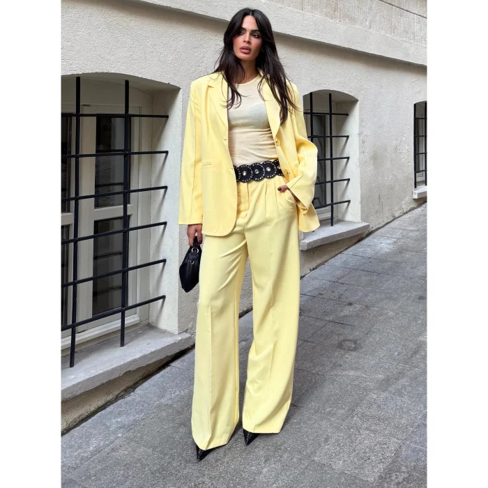 Pleated Palazzo Trousers Yellow offers both a stylish and comfortable wearing experience with its wide and comfortable cut. The trousers, which are given dynamism with pleated details, can be easily used in different combinations thanks to their soft brown tone.