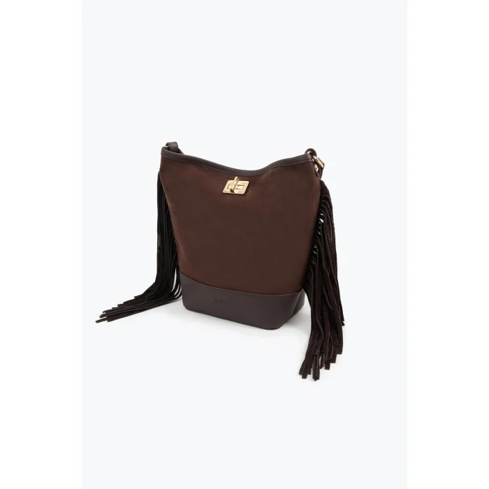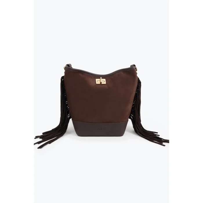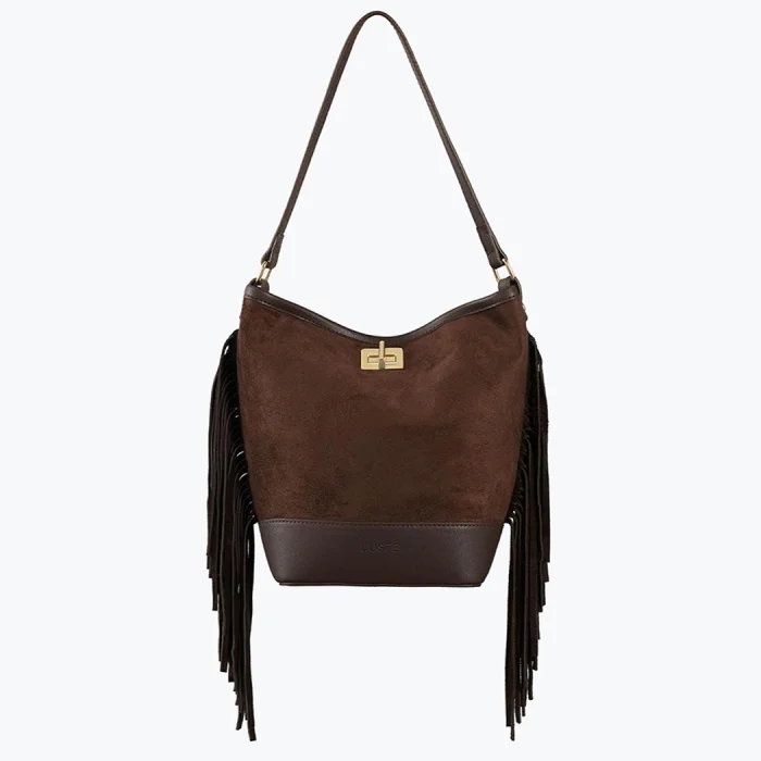 Reflecting Juste's elegant touch with its soft suede texture and flowing silhouette, the suede tasseled bag adds value to the style with its perfect simplicity.