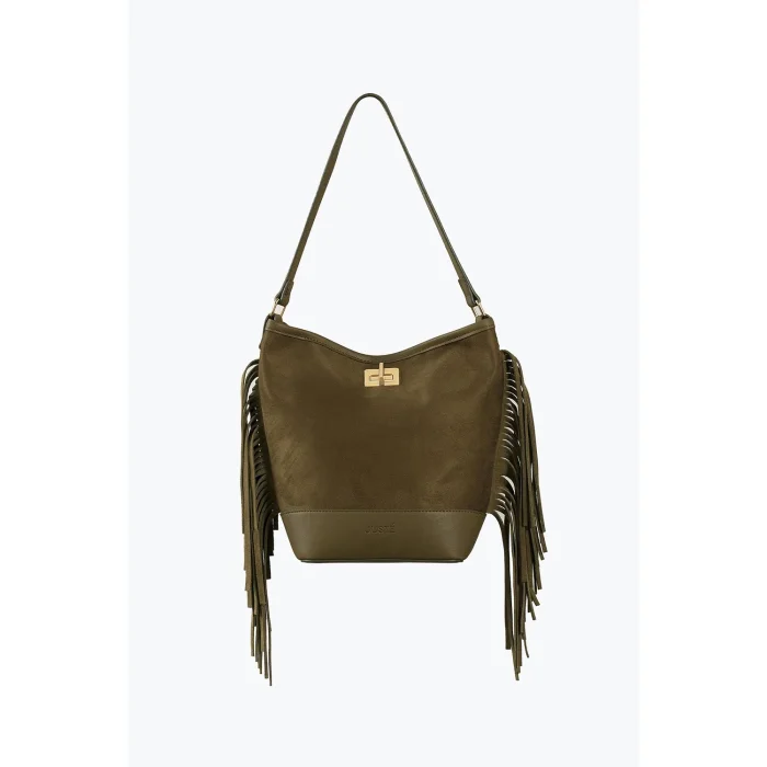 Reflecting Juste's elegant touch with its soft suede texture and flowing silhouette, the suede tasseled bag adds value to the style with its perfect simplicity.