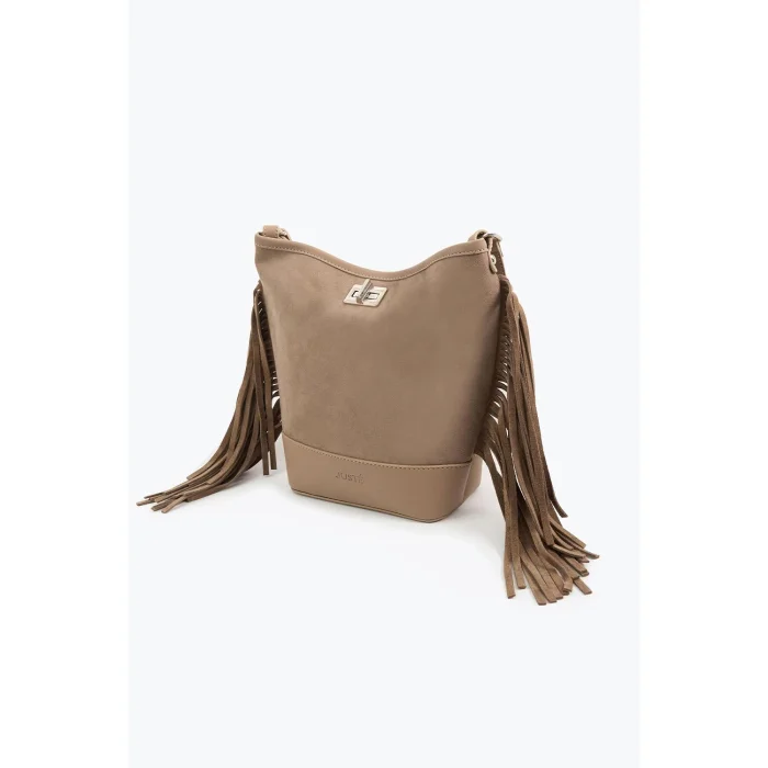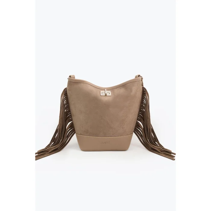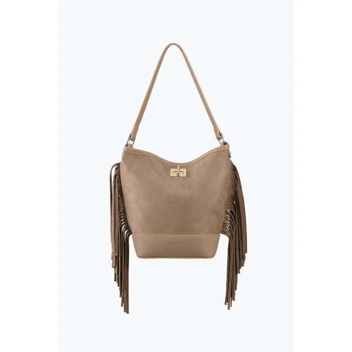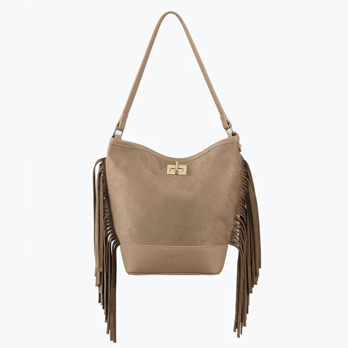 Reflecting Juste's elegant touch with its soft suede texture and flowing silhouette, the suede tasseled bag adds value to the style with its perfect simplicity.