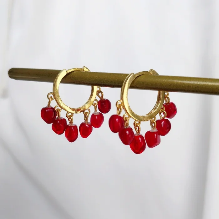 Lampwork pomegranete seed earring. It is made flameworking glass technique and handmade one-of a kind piece. 22K gold plate on silver hoop.