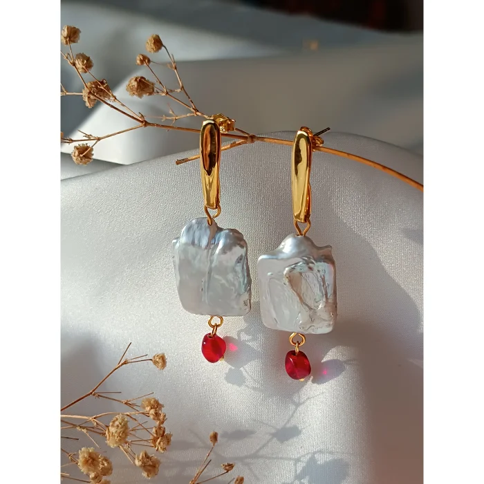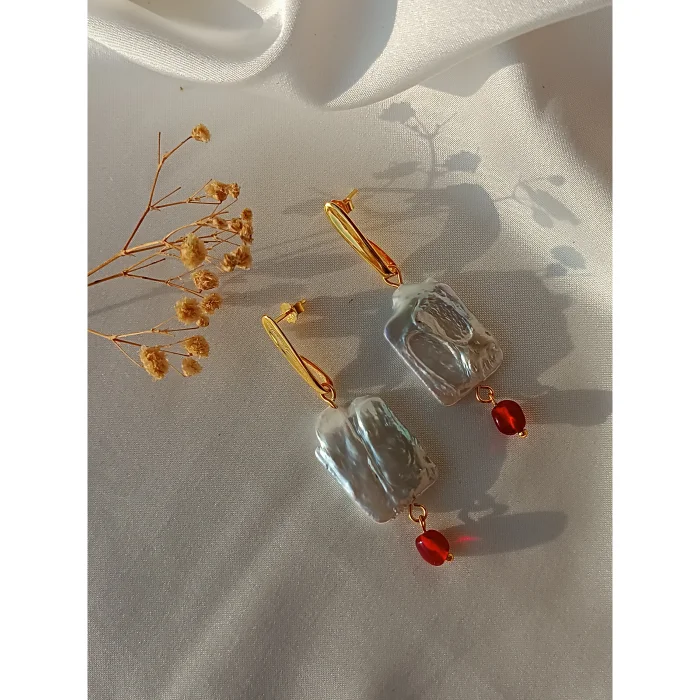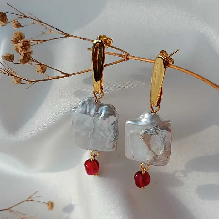 The pomegranates are made with open flame glass technique at 1200 degrees and are unique. Crafted with baroque pearls, they are real cultured pearls. Earring material is 925 sterling silver and gold plated.