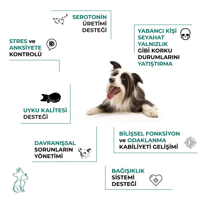 · L-Tryptophan: Increases the production of serotonin (happiness hormone) in the brain, regulating your dog's mood and allowing him to relax. It can reduce hyperactivity and promote relaxation.