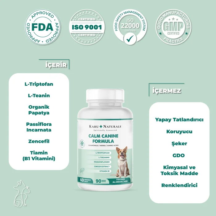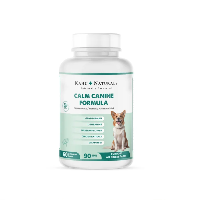 Kahu Naturals Calm Canine Plant-Based Calming Supplement is formulated with natural ingredients and herbal extracts to help dogs maintain their composure and prevent the negative effects of stress on their bodies during separation, travel stress, motion sickness, vet and caregiver visits, storms, fireworks, moves or other situations that may cause anxiety, and during tensions caused by changes in their daily routine.