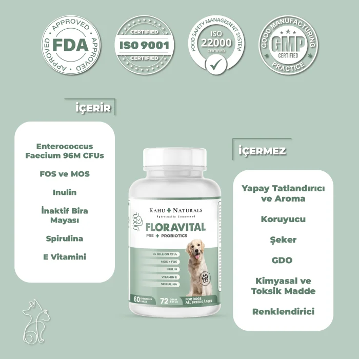 Ingredients Enterococcus Faecium (96M CFUs): Beneficial probiotics, the main ingredient of FloraVital, support the health of the gastrointestinal tract by balancing the intestinal flora of dogs.