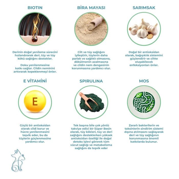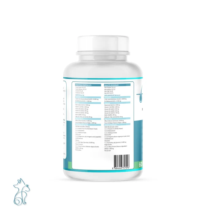 Formula Biotin (Vitamin B7) with Natural Ingredients: It is critical for healthy hair growth and skin health, strengthens the fur of our pawed friends and gives them shine. It contributes to tissue regeneration. It prevents dandruff by increasing the moisture of the skin.