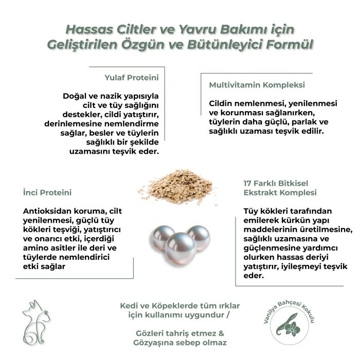 Ingredients Pearl Protein: While providing the moisture balance of the skin, it gives a silky softness and shine. Pearl protein helps nourish the skin and coats, creating a natural protective barrier.