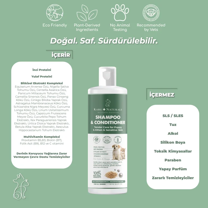 Kahu Naturals TenderCare Shampoo is specially formulated with original ingredients for our pawed friends with puppies and sensitive skin structure. It contains eco-friendly cleansers that do not harm the protective oils on the baby's skin or coat. It does not irritate the eyes and does not cause tears. Its herbal ingredients provide gentle cleansing and help to soothe and nourish the skin. It regulates the sebum balance of the skin and gives shine to the hairs and makes them look healthier.