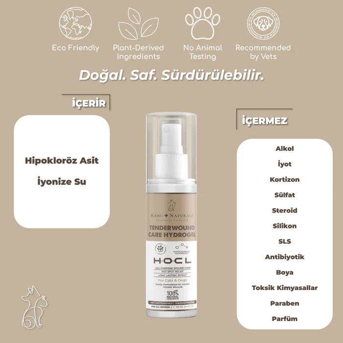 Kahu Naturals Paw & Coat Purest Cleanser, whose main active ingredient is hypochlorous acid, provides effective cleaning by instantly removing bacteria and dirt. With its antimicrobial properties, it can be used safely all over your pawed friend's body, including paws and sensitive areas.