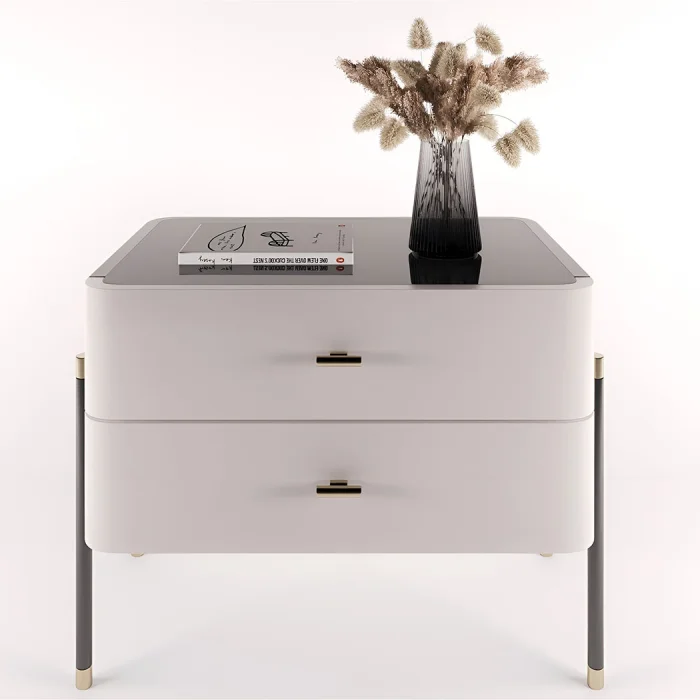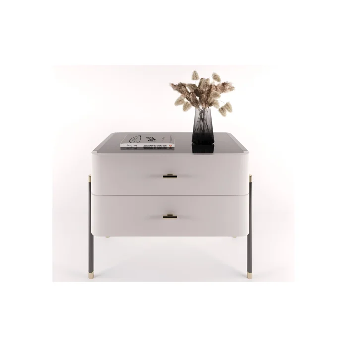 Soft Nightstand stands out as a piece that will add elegance to every bedroom with its modern and elegant design. With its straight lines, minimalist structure and elegant details, it adds a touch of sophistication to your room. The black glass surface used on the top is both stylish and durable, while also highlighting any decorative object or accessory inside.