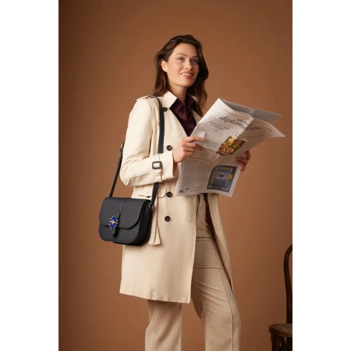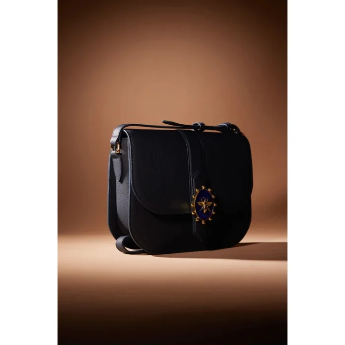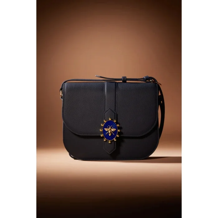 100% leather Colour: Navy Blue, with Queen Bee Jewellery (handmade, gold-plated bronze interchangeable jewellery) Strap: Adjustable Strap Length: 45 cm Max: 54 cm Interior: Zippered pocket and a small pocket
