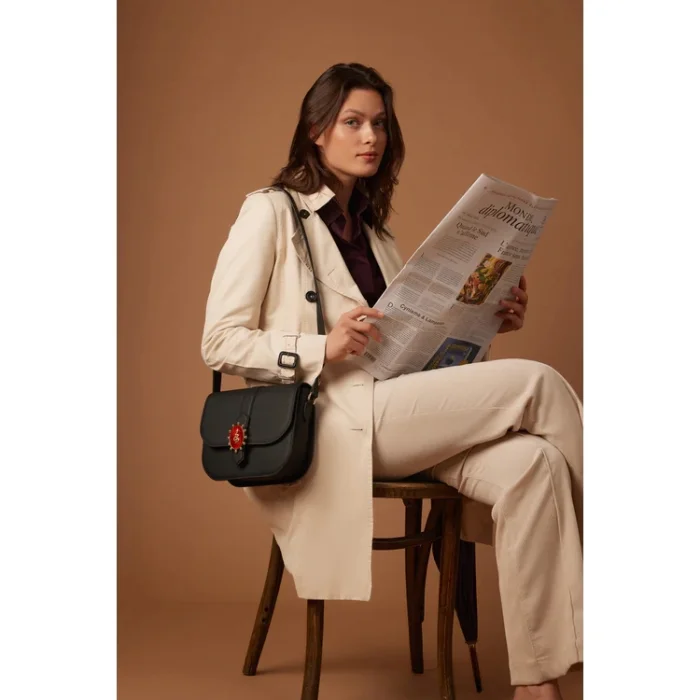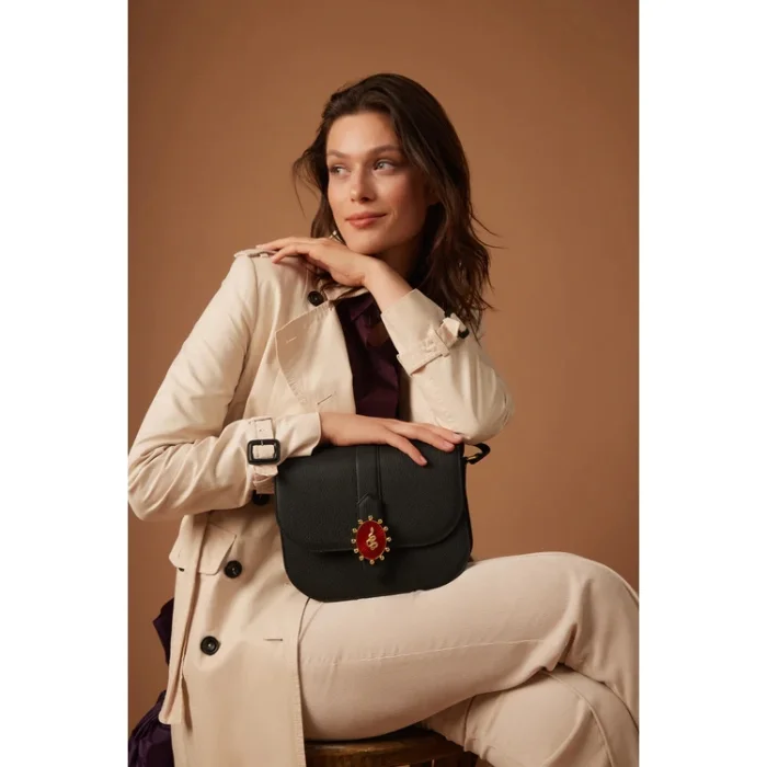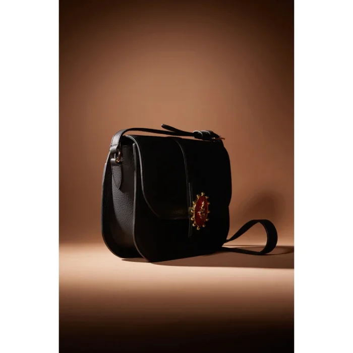 100% leather Color: Black, with Mystic Jewellery (handmade, gold-plated bronze interchangeable jewellery) Strap: Adjustable Strap Length: 45 cm Max: 54 cm Interior: Zippered pocket and a small pocket
