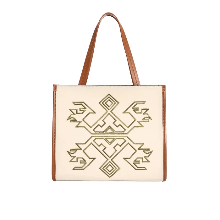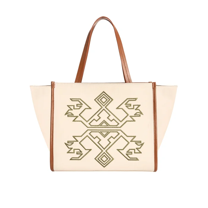 •Oversized bag with leather detail made of embroidered canvas fabric suitable for use on the hand & shoulder