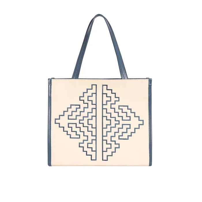 •Oversized bag with leather detail made of embroidered canvas fabric suitable for use on the hand & shoulder
