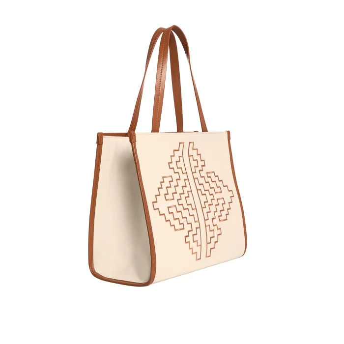 •Oversized bag with leather detail made of embroidered canvas fabric suitable for use on the hand & shoulder