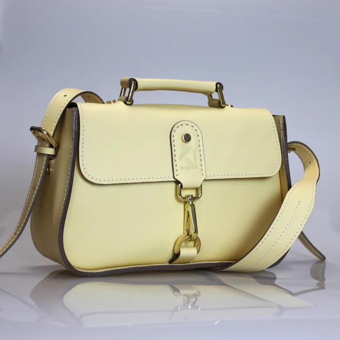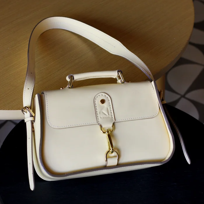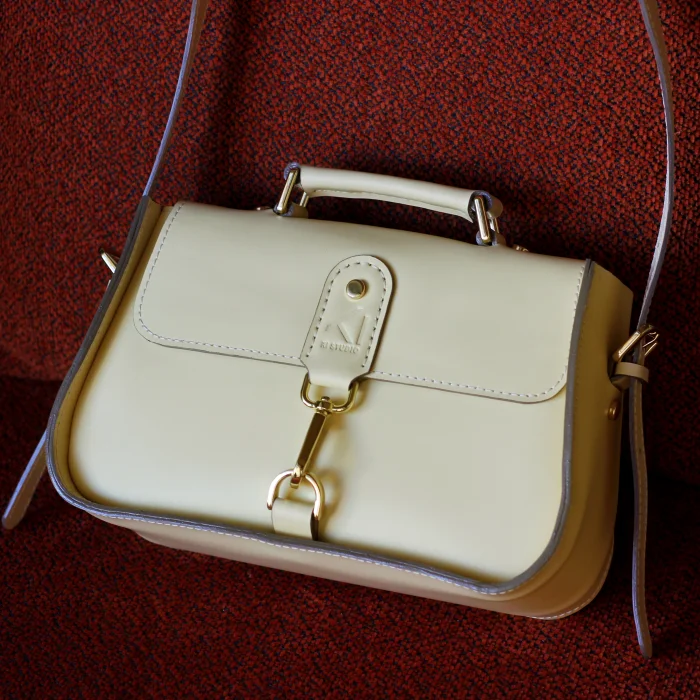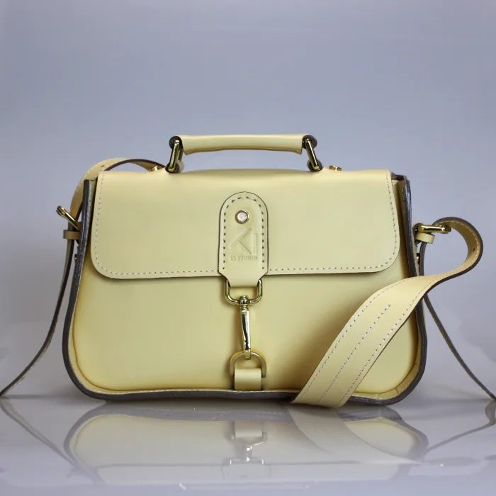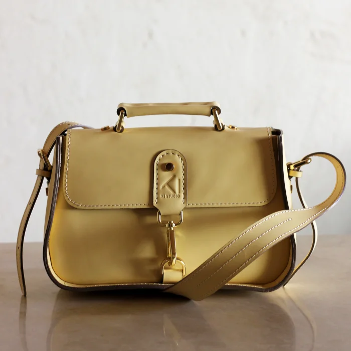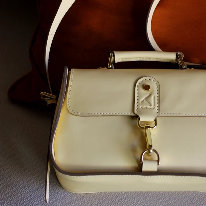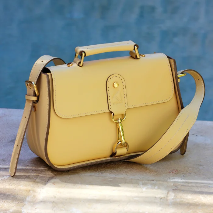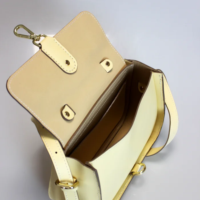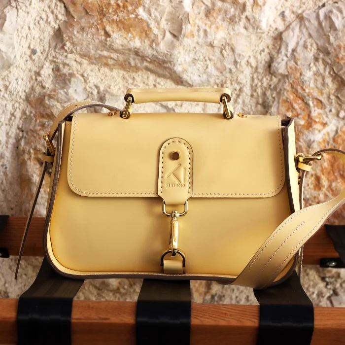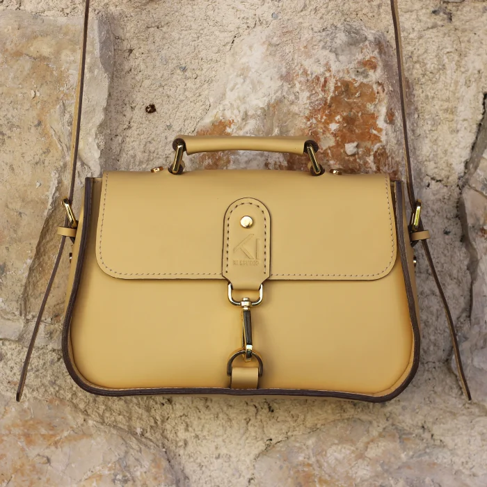 Material Used: Genuine calf leather, high quality metal accessories in light gold color and polyester waxed rope. Dimensions: Width 27 cm, Length 20 cm, Depth: 11 cm.