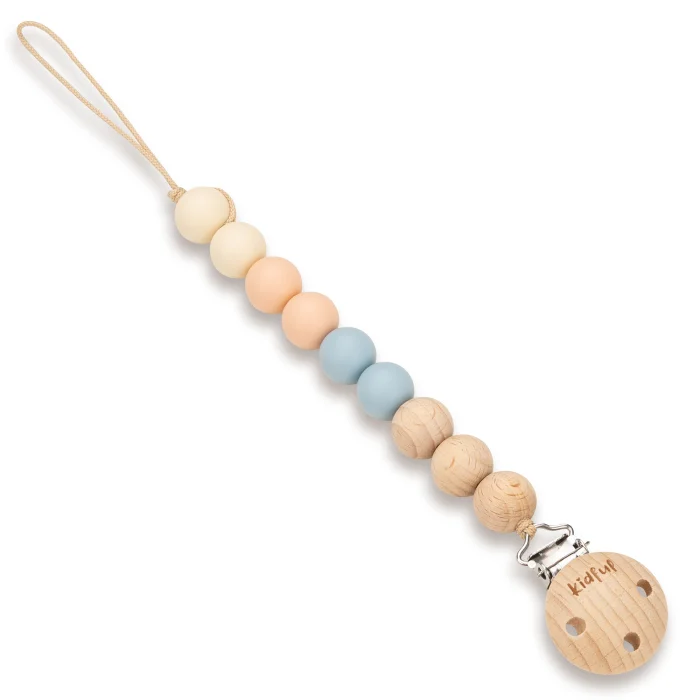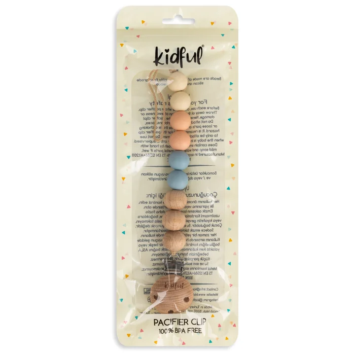 We can't just call Kidful's new handmade pacifier holder line beautiful; In addition to its beauty, we would like you to know that children's health and safety are prioritized in every detail.; Kidful's new series bead hangers use natural 100% beech wood and first-class, food-contact silicones suitable for use in children's products. Premium quality odorless silicones are BPA-free.; To be long-lasting and durable, the metal clamp under the wooden clip is chrome-free, lead-free and made entirely of stainless steel.; There is a plastic attachment on the clip to prevent damage to clothes.; The anti-break thread used in the product is produced in Japan with Oeko Tex certification and the pacifier strap is fastened using a special lock system. You can use Kidful's new and colorful pacifier holder series, produced in accordance with EN 12586 standards, with pleasure and confidence without any wear and tear problems. You can complement your Kidful pacifier straps with Bibs pacifiers.; Care Instructions: Hand wash with water and liquid soap.; Do not leave the metal parts wet and damp.
