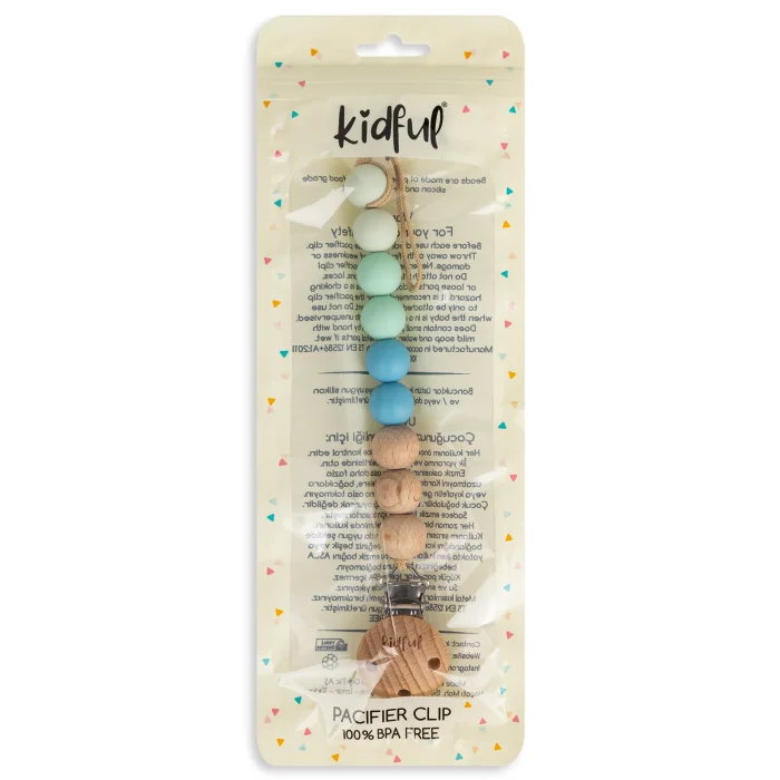 We can't just call Kidful's new handmade pacifier holder line beautiful; In addition to its beauty, we would like you to know that children's health and safety are prioritized in every detail.; Kidful's new series bead hangers use natural 100% beech wood and first-class, food-contact silicones suitable for use in children's products. Premium quality odorless silicones are BPA-free.; To be long-lasting and durable, the metal clamp under the wooden clip is chrome-free, lead-free and made entirely of stainless steel.; There is a plastic attachment on the clip to prevent damage to clothes.; The anti-break thread used in the product is produced in Japan with Oeko Tex certification and the pacifier strap is fastened using a special lock system. You can use Kidful's new and colorful pacifier holder series, produced in accordance with EN 12586 standards, with pleasure and confidence without any wear and tear problems. You can complement your Kidful pacifier straps with Bibs pacifiers.; Care Instructions: Hand wash with water and liquid soap.; Do not leave the metal parts wet and damp.