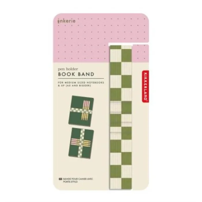 Translated text: Show off your fresh stationery style with a variety of notebooks in these 3 vibrant colorways. Contains 96 pages of lined, spiral-bound FSC paper. A5 size with 6mm pitch. Please note that this product is diverse. You will get a random color/design. Design: Materials: FSC paperPackaging: FSC belly bandKeep your pen handy (holds 4 pens) and also organize any loose cards or notes you have in your book or journal. Fits most medium-sized notebooks.
