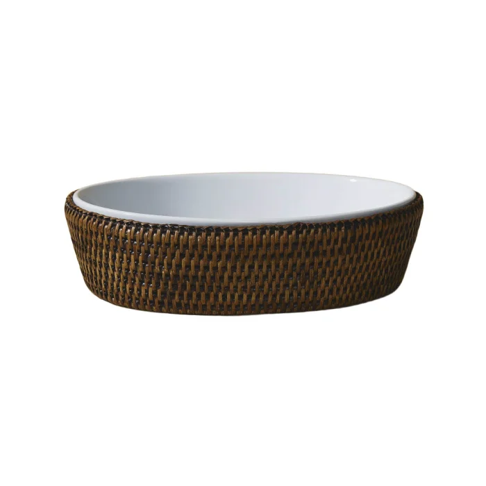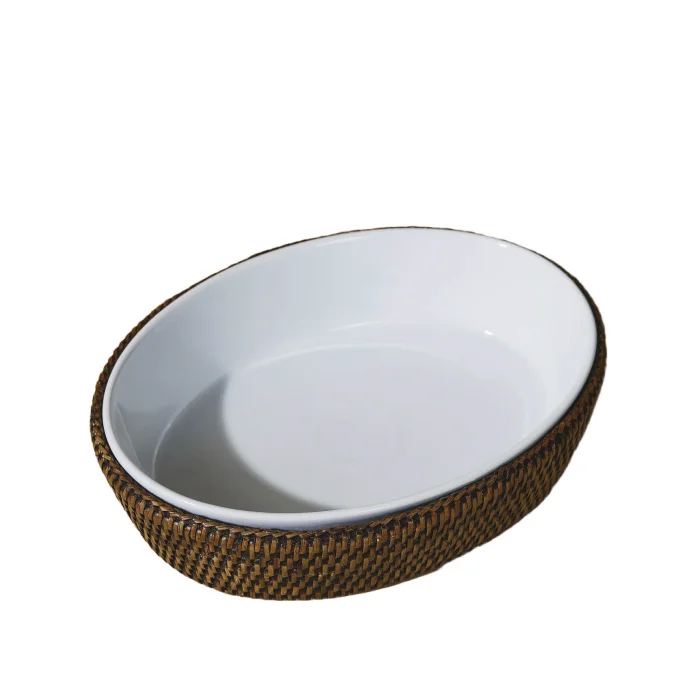 Ellipse Rattan Baking Dish: Made using sustainable 1st class rattan, this product is made with the traditional tight hand-knitting technique used by master craftsmen in Yangon. Color: Matte Dark Brown Material: Handmade rattan, heat resistant porcelain Size: 21.5(L)X21.5(W)X8(H) cm