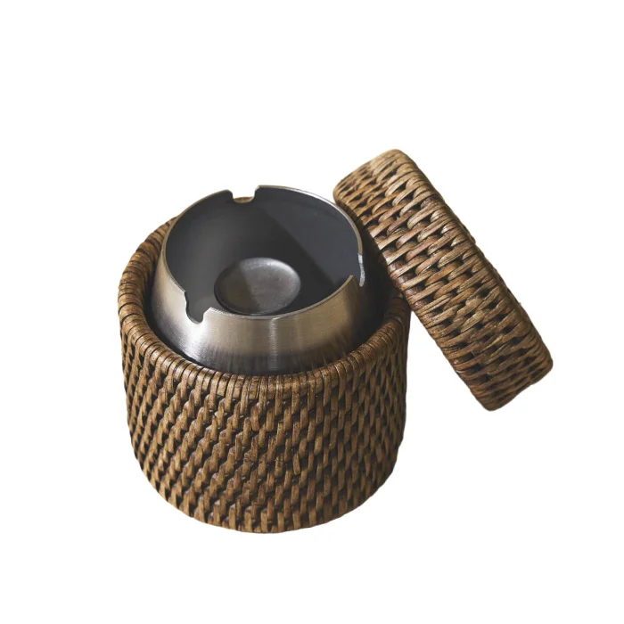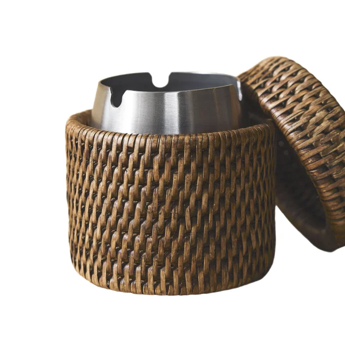 High Rattan Ashtray: Made using sustainable 1st class rattan, this product is made with the traditional tight hand-knitting technique used by master artisans in Yangon. Color: Matte Medium Brown Material: Handmade rattan, stainless steel Size: 9(L)X9(W)X10(H) cm