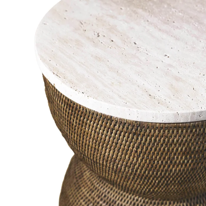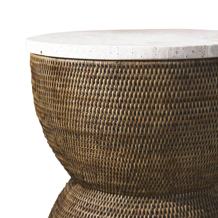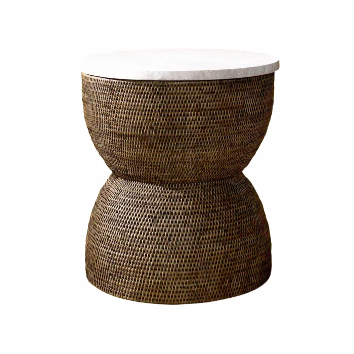 Hourglass Rattan Side Table: Made using sustainable 1st class rattan, this product is made with the traditional tight hand-knitting technique used by master craftsmen in Yangon. Color: Matte Medium Brown Material: Handmade Rattan, Travertine Size: 40.5(L)X40.5(W)X47(H) cm