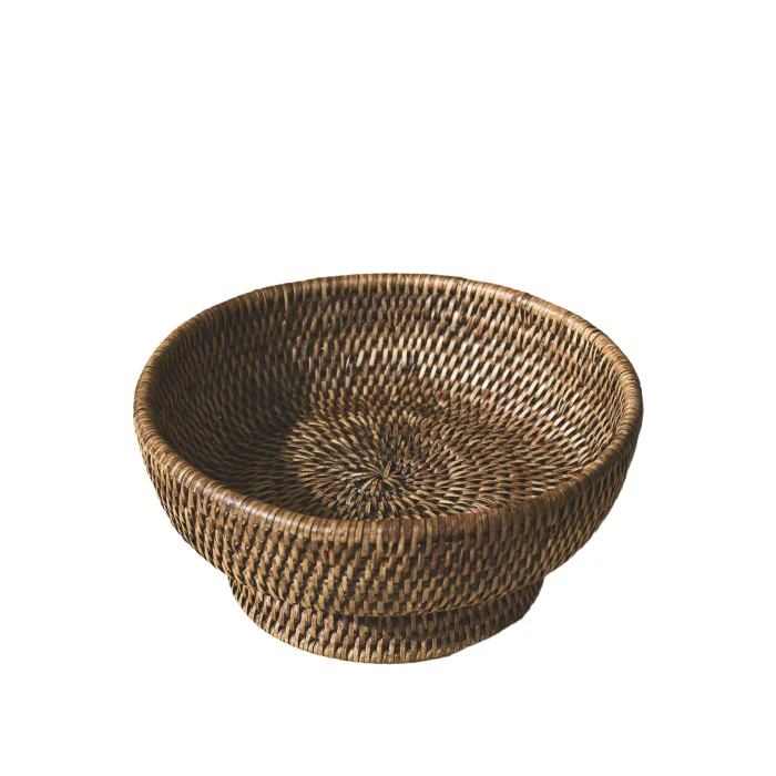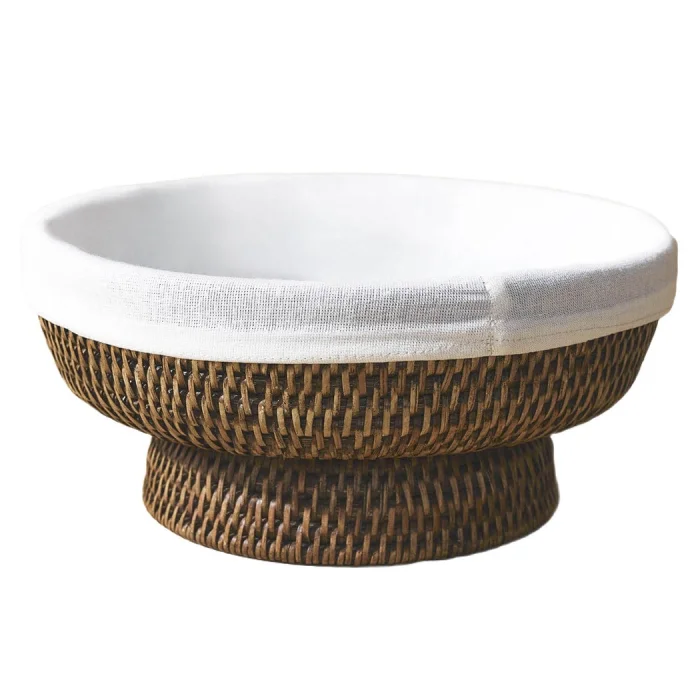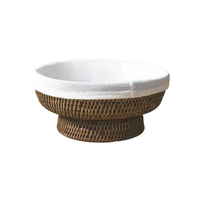 Rattan Bread Basket: Made using sustainable 1st class rattan, this product is made with the traditional tight hand-knitting technique used by master artisans in Yangon. Color: Matte White Tumbled Material: Handmade rattan, organic cotton Size: 26(L)X26(W)X12(H) cm