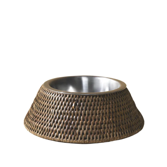 Rattan Pet Food Bowl: Made using sustainable 1st class rattan, this product is made with the traditional tight hand-knitting technique used by master craftsmen in Yangon. Color: Matte Medium Brown Material: Handmade rattan, stainless steel Size: 24(L)X24(W)X8.5(H) cm