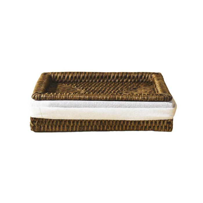 Rattan Bath Tray: Made using sustainable grade 1 rattan, this product is made with the traditional tight hand-knitting technique used by master artisans in Yangon. Color: Matte Medium Brown Material: Handmade rattan, organic cotton Size: 15.5(L)X15.5(W)X6(H) cm
