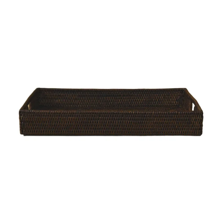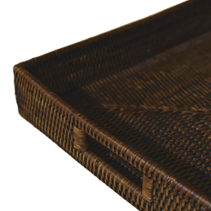 Rectangular Rattan Serving Tray: Made using sustainable 1st class rattan, this product is made with the traditional tight hand-knitting technique used by master craftsmen in Yangon. Color: Matte Dark Brown Material: Handmade Rattan Size: 41(L)X41(W)X8(H) cm