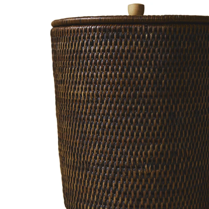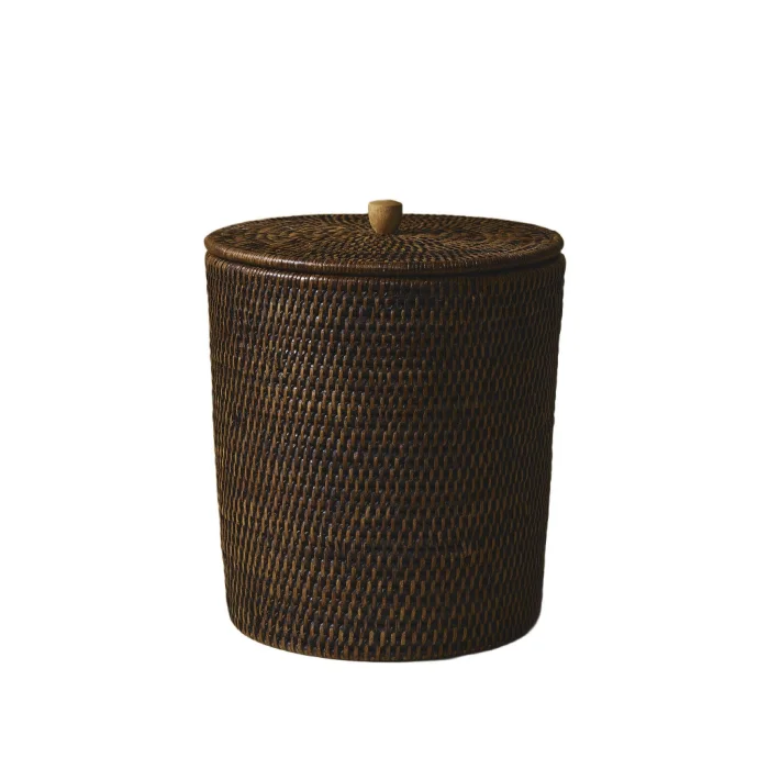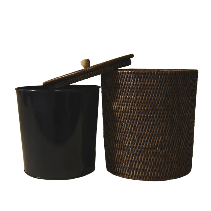 Rattan Dustbin with Lid: Made using sustainable 1st class rattan, this product is made with the traditional tight hand-knitting technique used by master craftsmen in Yangon. Color: Matte Dark Brown Material: Handmade rattan, zinc alloy Size: 25(L)X25(W)X30.5(H) cm