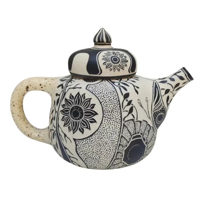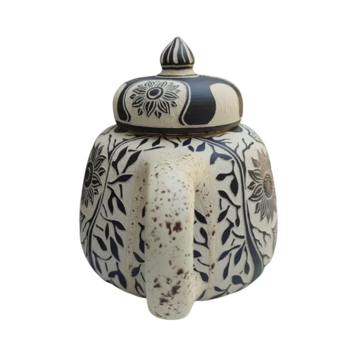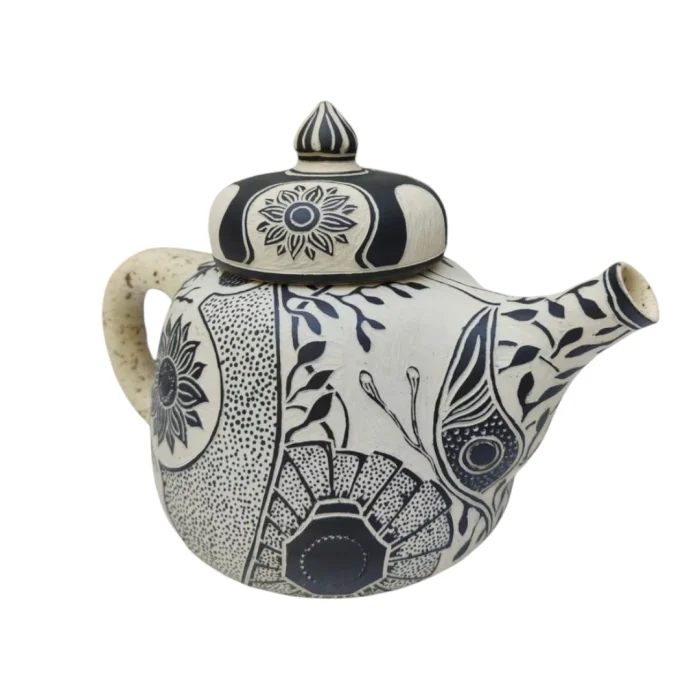 El yapımı ve elde kazınarak desenlendirilmiş stonew-are seramik demlik.