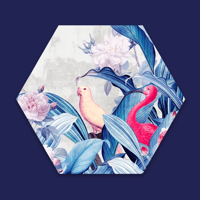The dynamic composition of the red bird and the yellow parrot surrounded by flowers symbolizes the harmony of contrasting colors and the balance in nature. Vibrant red and yellow tones bring movement and energy to the space, while floral details add softness to the composition.