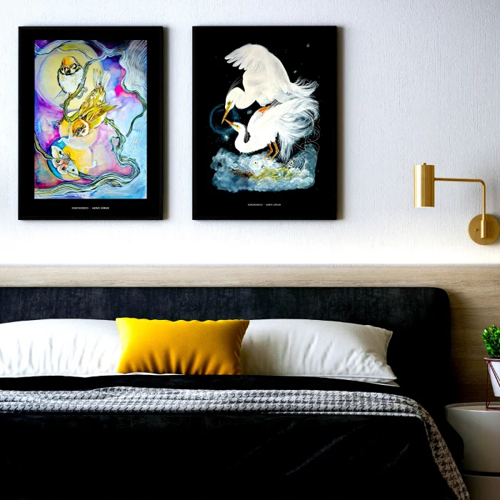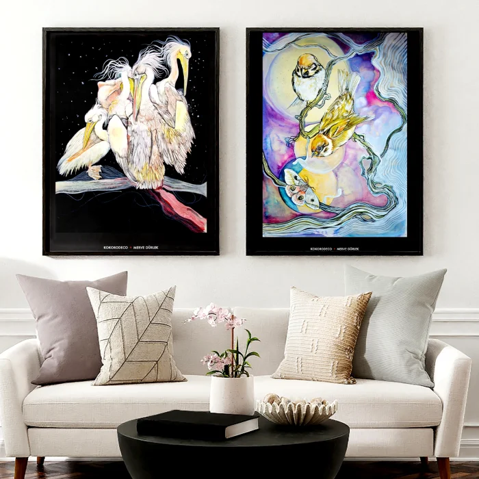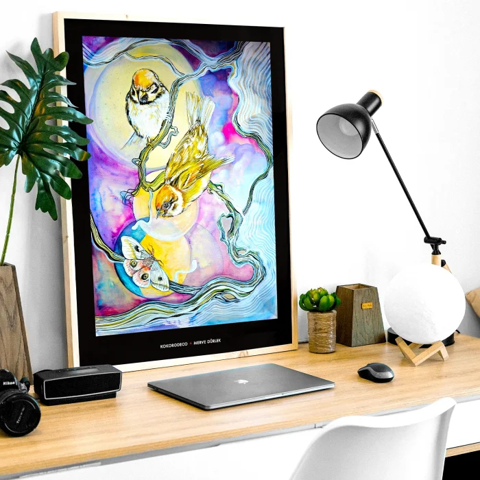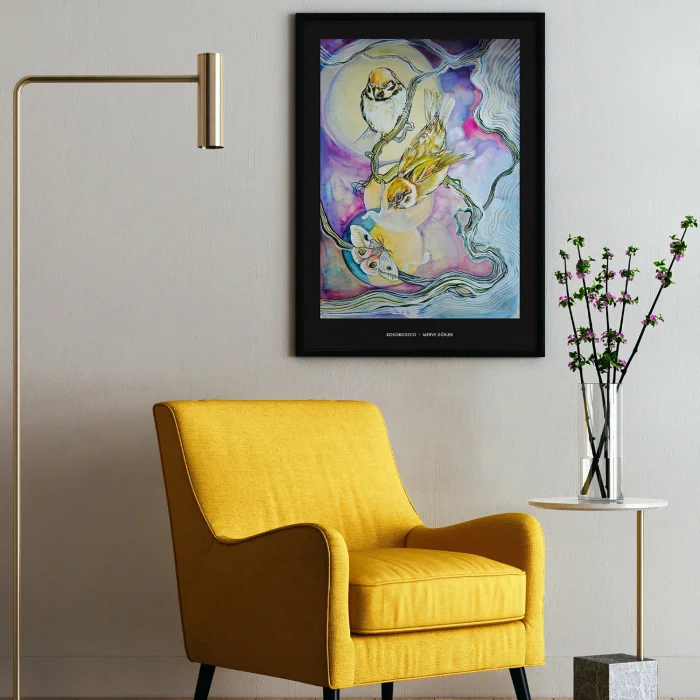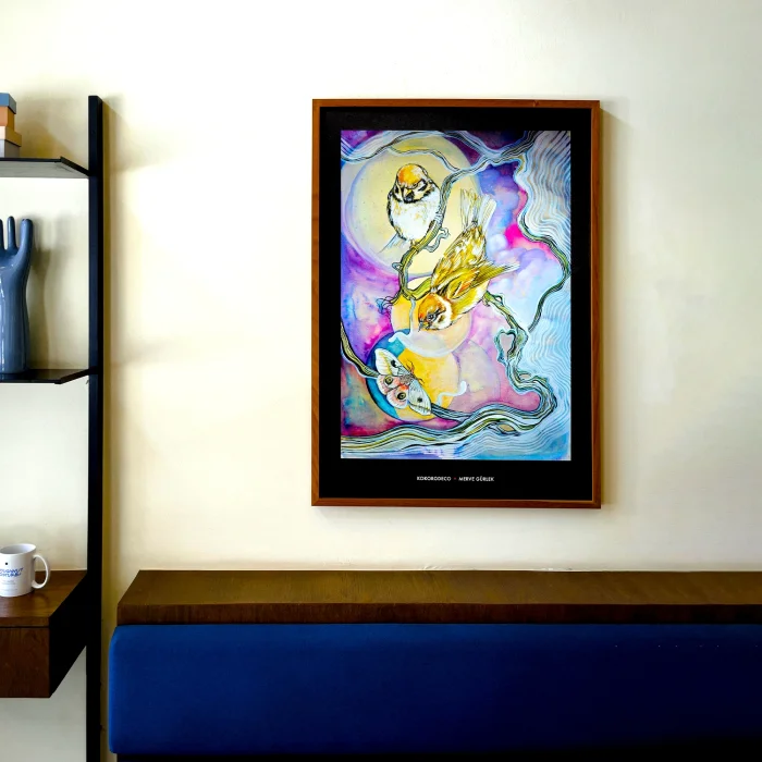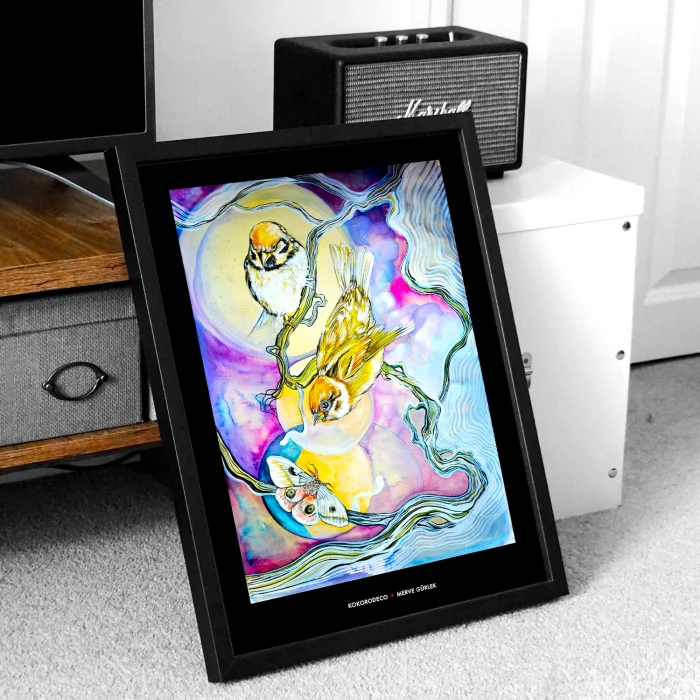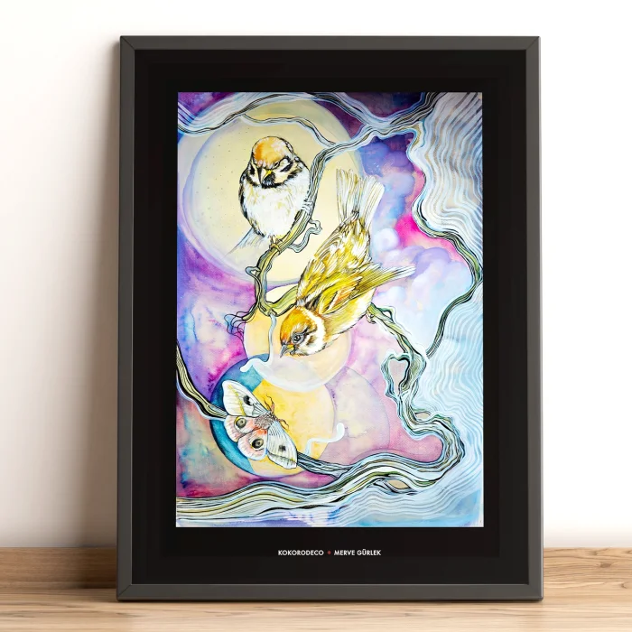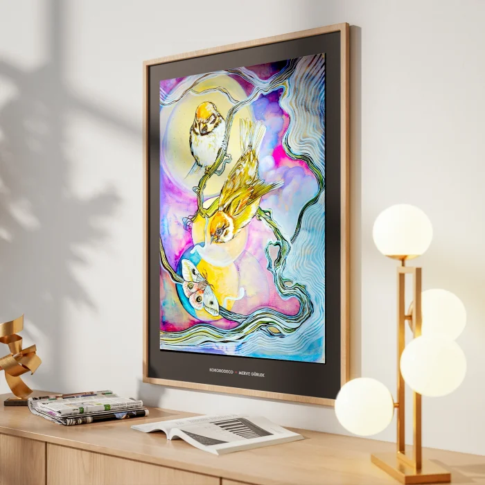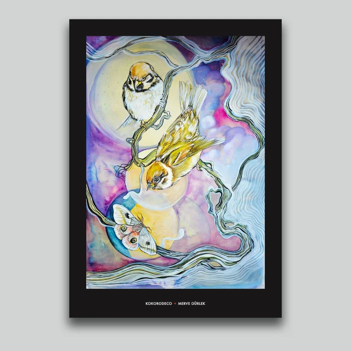 The composition, in which two sparrows and a butterfly come together, gives the work a light, balanced and poetic expression. Colors and lines are reproduced using a professional printing method, preserving the character of the original work.