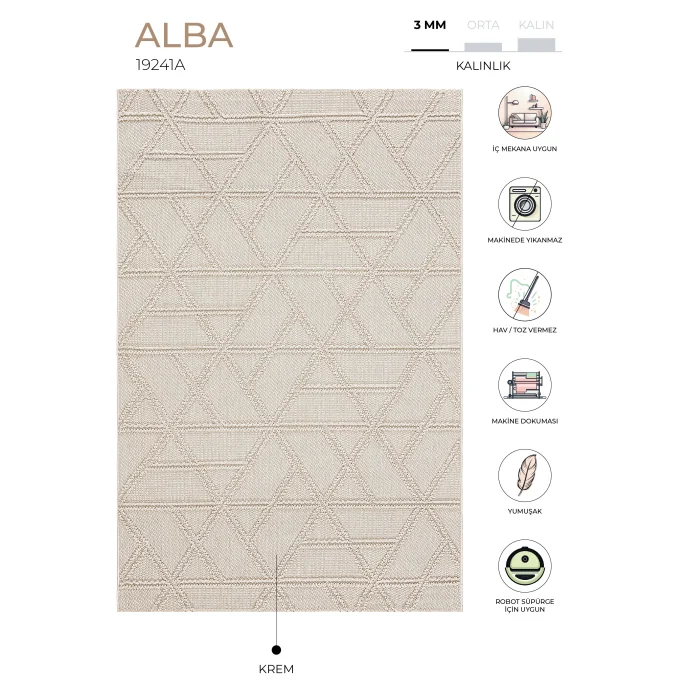 Alba Collection Alba Collection is made of high quality polypropylene yarn and is a magnificent option that attracts attention with its rich texture. Alba carpet, with its 7 mm pile height and high quality polypropylene content, offers a soft and comfortable feeling under your feet. Alba Collection is carefully designed with soft color options and calm geometric patterns that complement any decor. This aesthetically eye-catching collection is designed to add an elegant touch to your living spaces. Alba Collection has four different color options: cream beige, cream, gray cream and cream. Each pattern is enriched with carefully designed details, so you can create a unique atmosphere in your home or workplace. Ideal for those looking for decoration, comfort and elegance in their living spaces. It is suitable for indoor use in living rooms, living rooms and bedrooms. The carpet fits perfectly into any environment with its soft tones of cream and color. While this carpet brings dynamism and freshness to your room, it also creates a bright accent on the floor. With its stylish design and high-quality materials, it provides both a visually pleasing appearance and long-lasting use. Beautify your space with its minimalist and modern look by creating an elegant and stylish environment. Enrich your decor, comfort and ambiance with Alba, designed to add style to your living spaces. Alba Collection is an excellent option for long-term use, offering long-lasting and easy maintenance thanks to its durable structure. It does not cause dust and fluff. The carpet can be washed at the washing service. It is not recommended to use bleach and harsh chemicals. A damp cloth and carpet cleaner can be used for stain care. It is suitable for robot vacuum cleaner use. Note: Actual colors may vary depending on lighting and monitor settings. Carpets may have up to 5% difference in size due to production and variety of yarns used.