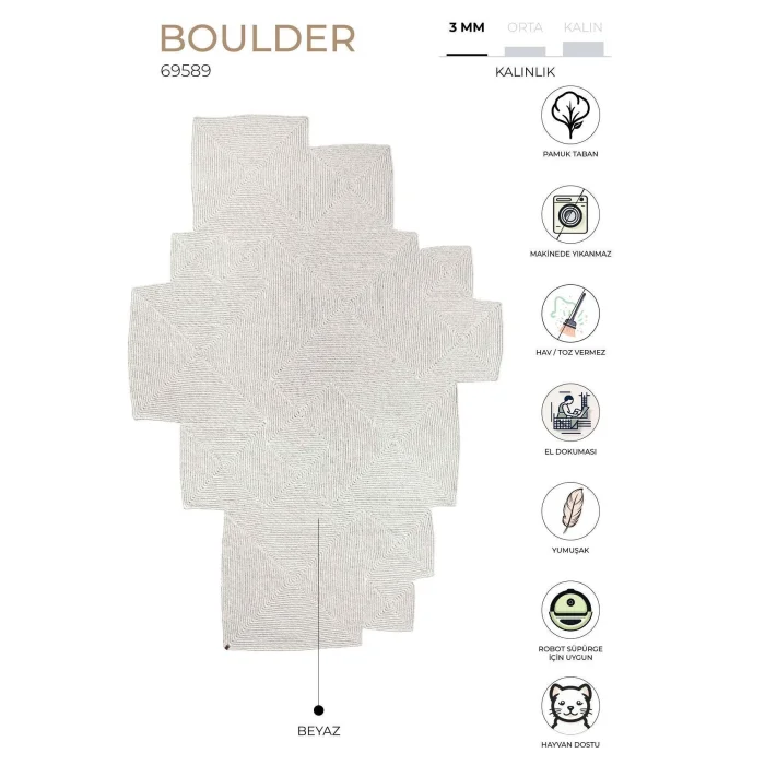 Boulder Collection, which is designed in an amorphous style by going beyond the classical carpet sizes and forms, is produced from a special yarn that is resistant to water and sun with its unique shapes. It is durable and suitable for use for many years. Usage areas: It is a functional carpet that you can use in every corner of your home with its unique structure. Suitable for areas with pets. Washing instructions: No machine washing. Wipe gently with a damp cloth.