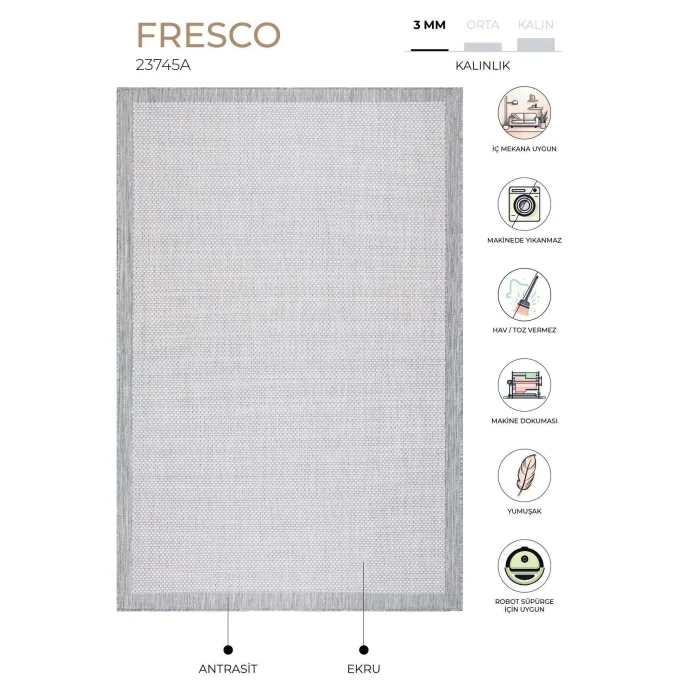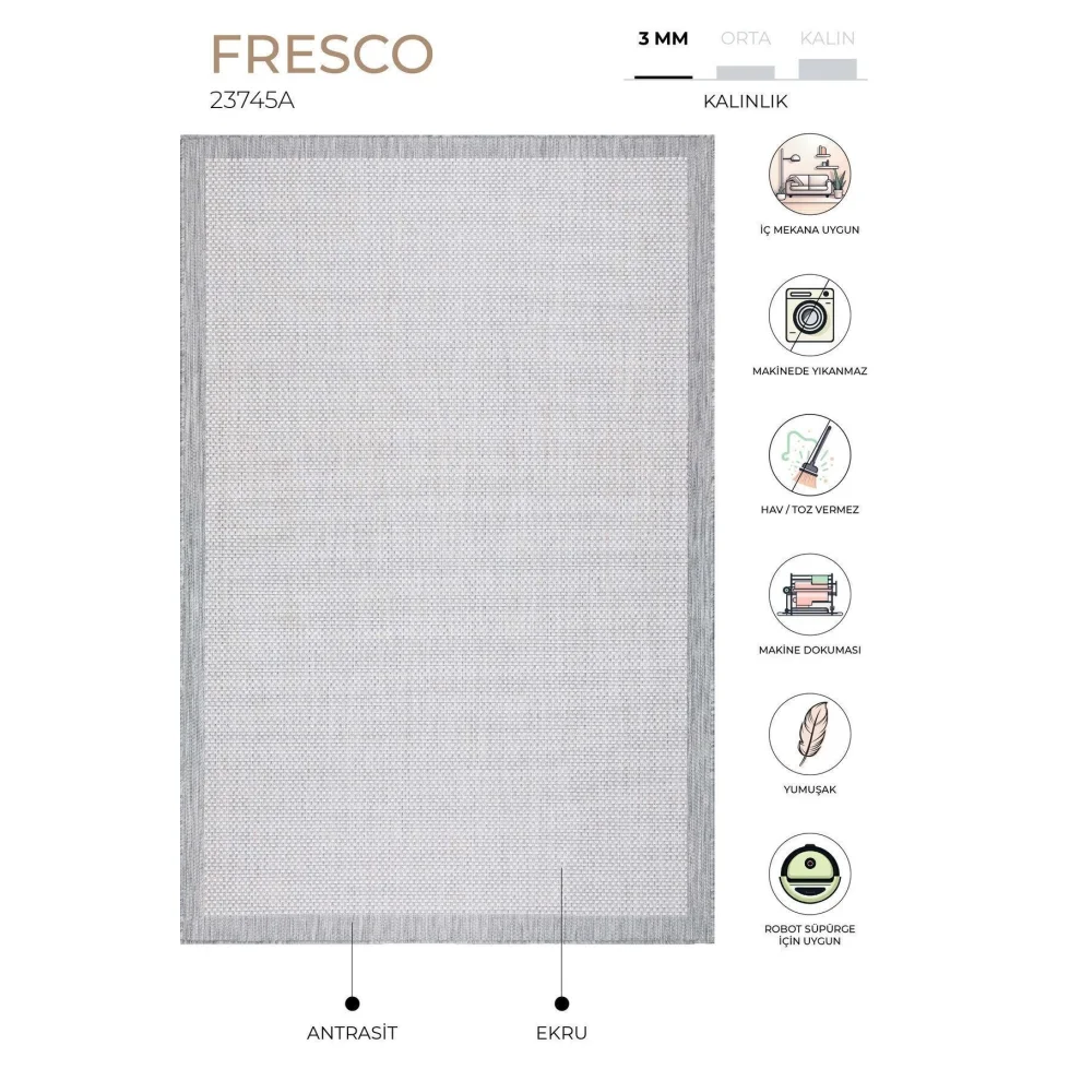 Fresco PRODUCT FEATURES Our Illusion quality produced using polypropylene; It is produced with Koza Carpet technology with a stitch density of 96,000 points. HOW WAS IT MADE? By using polypropylene in modern Koza Carpet looms; It is produced on high-speed computer-controlled machine benches with high stain resistance, long life, durability and color fading. TECHNICAL INFORMATION -Polypropylene -96.000 points -1,200gr/m2 USAGE AREAS -It can be used in balconies, terraces, entrances and kitchen areas. CARE AND CLEANING - It can be washed in the carpet cleaning service. Clean your carpet daily with a vacuum cleaner with a brush. Do not wipe with chemicals such as bleach, alcohol, etc. Do not wash it yourself, wipe it with a wet cloth and ventilate it. Sweep your carpet in the direction of the pile. Do not leave sharp, hard, heavy objects and items placed on the carpet in the same place for a long time. When not in use, keep your carpet in rolls away from moisture and vertically. Do not expose to direct sunlight. The above reasons and stains during use exclude your carpet from the scope of warranty.