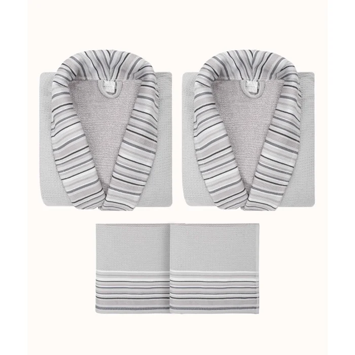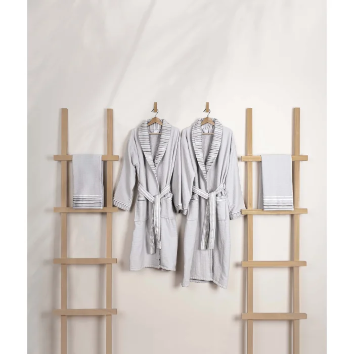 Limira Set of 4 Grey Cotton 2 Bathrobe (1 S-M)-(1 L-XL) 2 Towels 50x90 2242 Made from honeycomb textured cotton fabric for a luxurious feel. Includes 2 bathrobes and 2 50x90 towels for a comprehensive bathing experience. It offers a sporty and soft look with its gray tones. The set features a minimalist design for a timeless look. It offers a quality that enhances your bathing pleasure. Thanks to its water-absorbent fabric structure, it provides efficient drying. It's designed for quick drying, ensuring you're ready to conquer the day. Its honeycomb texture, meticulous design and water-absorbent fabric promise a unique bathing experience. Say goodbye to humidity and hello to comfort. It is recommended to wash at 30 degrees. To maintain the quality of the fabric, avoid washing it with harsh chemicals such as bleach or alcohol. Bleaching should not be done. It does not require ironing. Lay-out drying is recommended. During the drying process, avoid exposure to direct sunlight to avoid possible fabric damage. Note: Actual colors may differ depending on lighting and monitor settings.