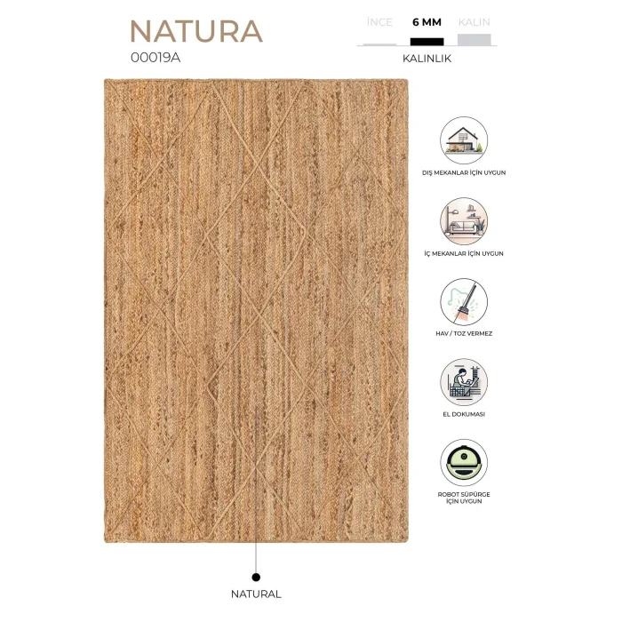 NATURA Jute is handloom-made in India from natural jute fibers. Jute carpets are hand-woven, special carpets produced from natural yarn that suit almost any style of decoration. It is recyclable, does not harm the ecological balance and is environmentally friendly. It is durable and unaffected by time, currents and trend wear. With its natural jute and cream knitting details, it brings the simplicity of natural textures to the environment. With its diamond-patterned structure, it elevates your décor with the movement of geometric patterns. Size options such as 90x150, 120x180, 160x240 and 200x290 cm are available. Natura Carpet features a minimal, modern flat-weave design that complements any décor. It is suitable for both indoor and outdoor use, is resistant to UV rays, resistant to moisture and mildew, and is easy to clean and maintain. Ideal for those looking for decoration, comfort and elegance in their living spaces. It's perfect for outdoors, gardens, and any space where you need durable and stylish floor coverings. The carpet blends seamlessly into any environment with its calm and natural tone. Beautify your space with its minimalist and modern look by creating an elegant and stylish environment. Due to the natural state of the plants, color differences, color transitions, spots and various differences in the body of the plant are reflected in the product as it is. Again, there may inevitably be plus/minus differences in very small dimensions in the measurement of handmade products. It should be wiped with a damp cloth. Note: Actual colors may differ depending on lighting and monitor settings.