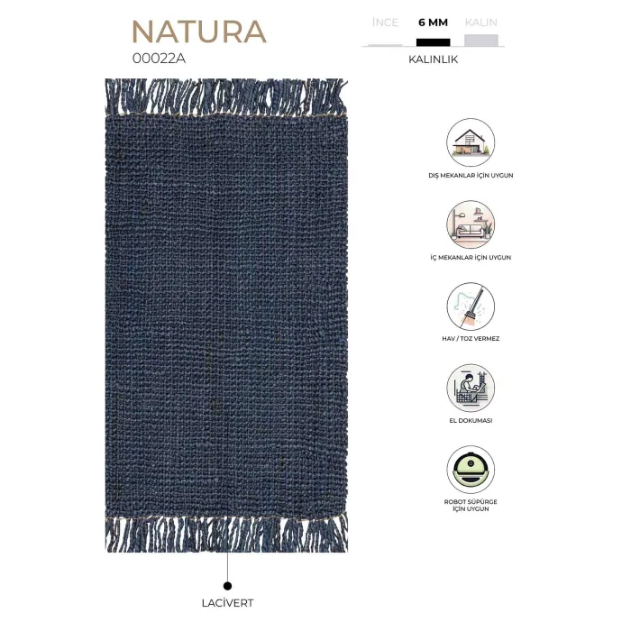 NATURA JUTE CARPET PRODUCT FEATURES It is produced on a handloom from natural jute fibers in India. Jute carpets are hand-woven, special carpets produced from natural yarn that suit almost any style of decoration. It is recyclable, does not harm the ecological balance and is environmentally friendly. It is durable and unaffected by time, currents and trend wear. Jute carpet models often stand out with their colors surrounded by relaxing earth tones. These carpet models, which are mostly covered in light colors with earth colors and cream tones, stand out a little more on dark floors and almost say I am here. Therefore, those who prefer dark colors in their floor coverings become the architects of the contrast they want to create in different spaces of their living spaces. Today, jute is dyed in addition to natural brown and has different colors and patterns. It is possible to see geometric patterned, tasseled and colorful jute carpets. It is made of natural jute and can be used on both sides. It revitalizes your home with its vivid and colorfast colors. It is suitable for indoor and outdoor use. Since the product is handmade, small color differences may occur in the products we will send. CARE AND CLEANING In case of crushing the pile threads under heavy items, the pile threads in this area should preferably be brushed first and then swept with a vacuum cleaner that performs the forging process. In order to prevent the dust accumulated on the carpet from settling between the pile threads and on the base, maintenance should be done by vacuuming at regular intervals with a vacuum cleaner. Sweeping should be done with a vacuum cleaner in the direction of sweeping the pile threads of the carpet and with slow movements. The carpet should not be exposed to hard impacts such as beating and whipping during cleaning. Excessive use of water and shampoo should be avoided when cleaning the carpet. Never use bleach and similar chemical aggravants while washing your carpet. Wash your carpet using detergent and fabric softener in accordance with TSE. A staining substance spilled on the carpet can be removed immediately and if it is intervened correctly. The resulting stain should first be absorbed at the high level of the vacuum cleaner and then cleaned with a small amount of water and carpet shampoo with movements in the direction of sweeping, the remaining moisture after the cleaning process should be removed by buffering with a vacuum cleaner or a moisture-absorbing cloth or similar material (tissue paper, etc.). The stain removal process should first be tried on an invisible part of the carpet with a chemical substance to be used in stain removal. The pile threads in the area where the cleaning process is carried out should be combed with a brush so that they stand upright. It should be kept away from carpets, stoves and similar heat appliances. The carpet should not be left in such an environment for a long time, as direct sunlight will damage the carpet. During transportation, the carpet should not be allowed to get wet, and hard, sharp and sharp objects should not be allowed to damage the carpet. "In the product you buy, there can be a difference of up to 5% in the width and length of the carpets caused by the production and different yarns used."