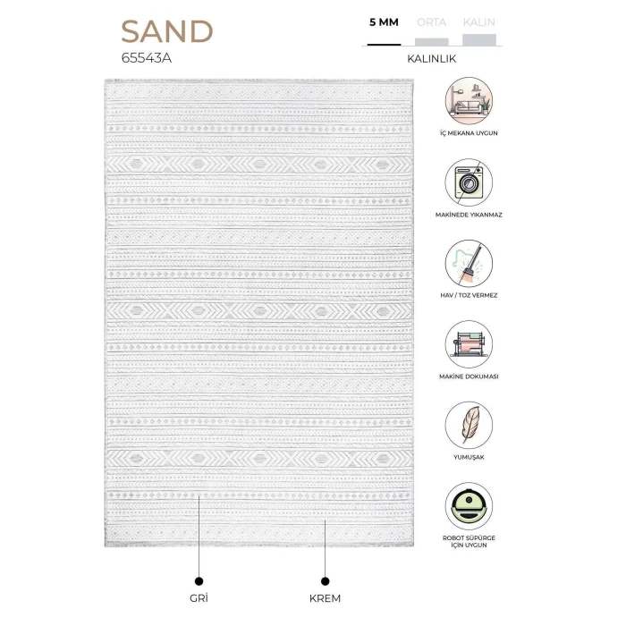 SAND PRODUCT FEATURES Our Sand collection is produced using polypropylene with Koza Carpet technology with a pile height of 4mm and a density of 320,000 stitches. HOW WAS IT MADE? By using polypropylene in modern Koza Carpet looms; It is produced on high-speed computer-controlled machine benches with high stain resistance, long life, durability and color fading. TECHNICAL INFORMATION -Polypropylene -320.000 stitches -4mm pile height -1,250gr/m2 USAGE AREAS -It can be used in balcony and terrace areas. CARE AND CLEANING Clean your carpet daily with a vacuum cleaner with a brush. Do not wipe with chemicals such as bleach, alcohol, etc. Do not wash it yourself, wipe it with a wet cloth and ventilate it. Sweep your carpet in the direction of the pile. Do not leave sharp, hard, heavy objects and items placed on the carpet in the same place for a long time. When not in use, keep your carpet in rolls away from moisture and vertically. Do not expose to direct sunlight. The above reasons and stains during use exclude your carpet from the scope of warranty.