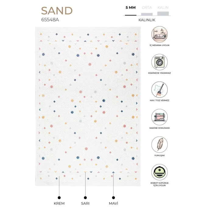 SAND PRODUCT FEATURES Our Sand collection is produced using polypropylene with Koza Carpet technology with a pile height of 4mm and a density of 320,000 stitches. HOW WAS IT MADE? By using polypropylene in modern Koza Carpet looms; It is produced on high-speed computer-controlled machine benches with high stain resistance, long life, durability and color fading. TECHNICAL INFORMATION -Polypropylene -320.000 stitches -4mm pile height -1,250gr/m2 USAGE AREAS -It can be used in balcony and terrace areas. CARE AND CLEANING Clean your carpet daily with a vacuum cleaner with a brush. Do not wipe with chemicals such as bleach, alcohol, etc. Do not wash it yourself, wipe it with a wet cloth and ventilate it. Sweep your carpet in the direction of the pile. Do not leave sharp, hard, heavy objects and items placed on the carpet in the same place for a long time. When not in use, keep your carpet in rolls away from moisture and vertically. Do not expose to direct sunlight. The above reasons and stains during use exclude your carpet from the scope of warranty.